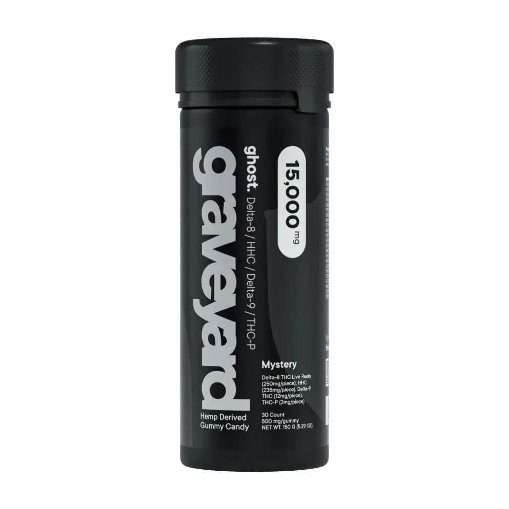 Dive into the unexpected with Mystery Graveyard Gummies. Each jar contains 15,000mg of Delta-8 THC, HHC, Delta-9 THC, and THC-P, delivering a powerful and unpredictable taste adventure.